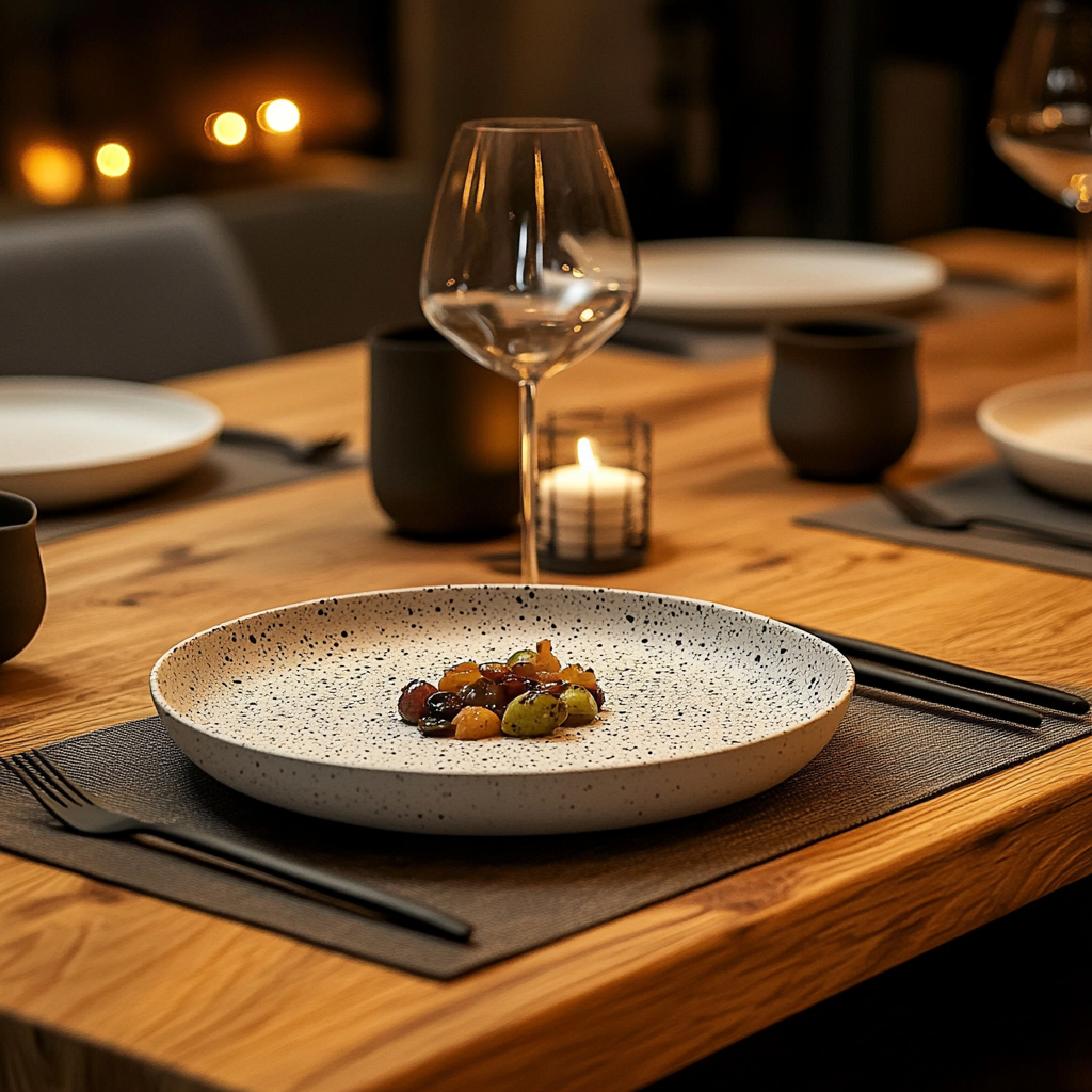 Another popular choice is speckled stoneware plates, which offer a tactile, artisanal feel. Their organic textures pair beautifully with wood tables and soft lighting, making them ideal for restaurants seeking a warm, contemporary identity. Stoneware’s natural imperfections create visual depth, helping ingredients stand out.