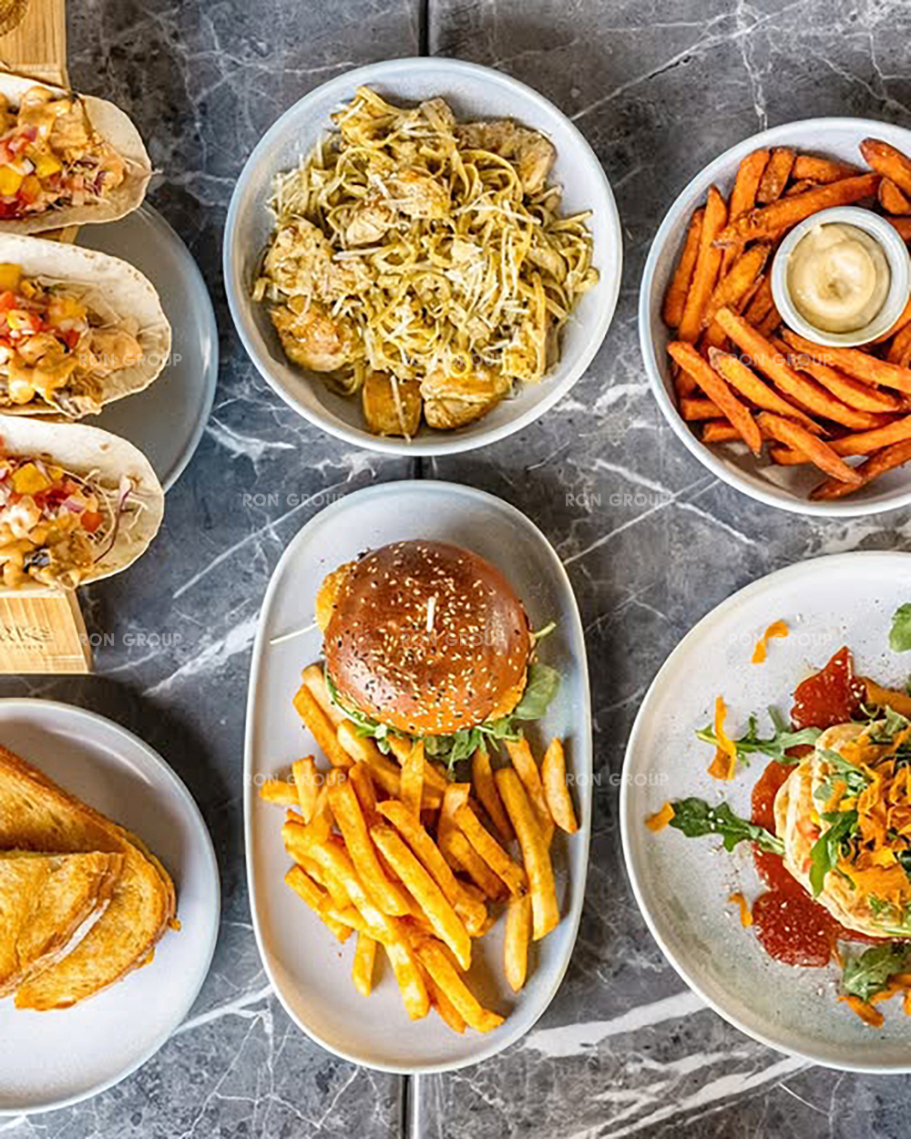 A café menu often includes colorful dishes such as salads, sandwiches, burgers, and pasta. Serving them on vibrant ceramic plates or neutral-toned stoneware enhances presentation. For example, fries and burgers look more appealing on wide, flat plates, while fresh salads pop in round bowls. Well-chosen tableware adds value to the food, making it Instagram-worthy and appealing to social media-driven customers.