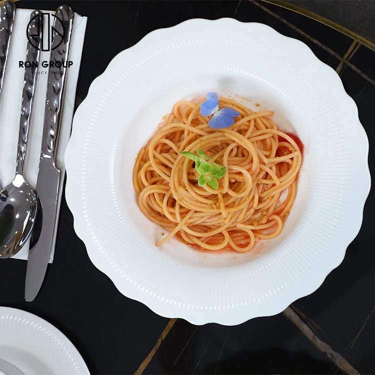 • Custom White Flower Rim Ceramic Pasta Plate for Noodles and Dessert Service