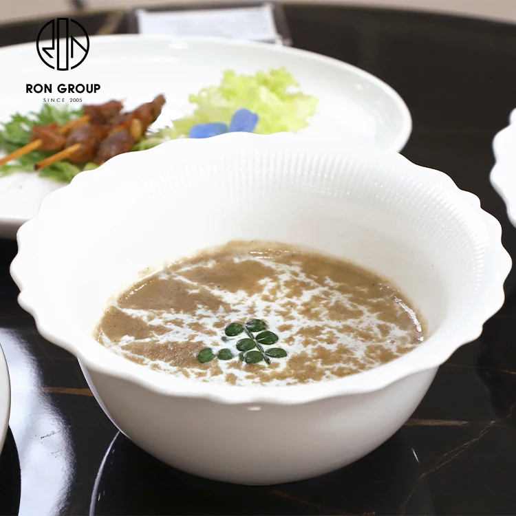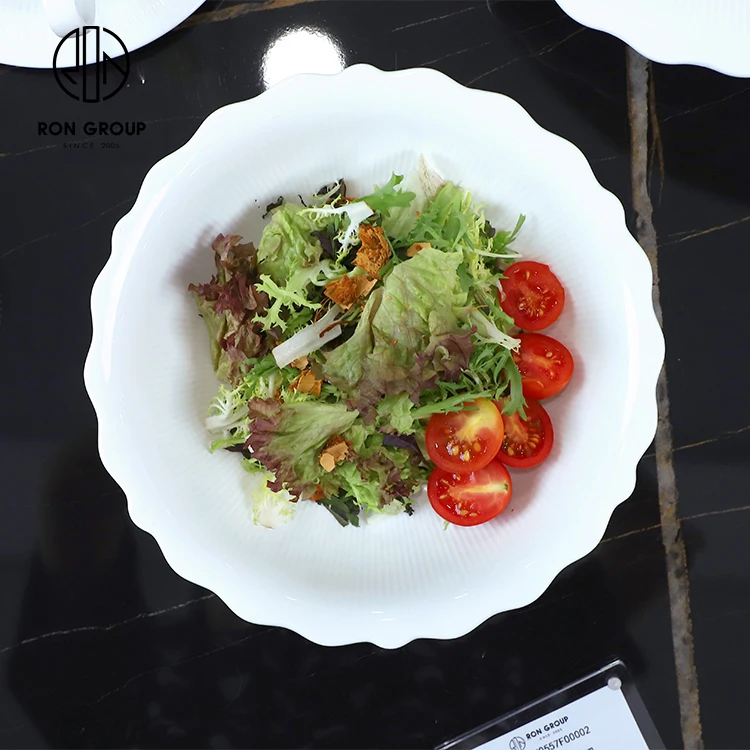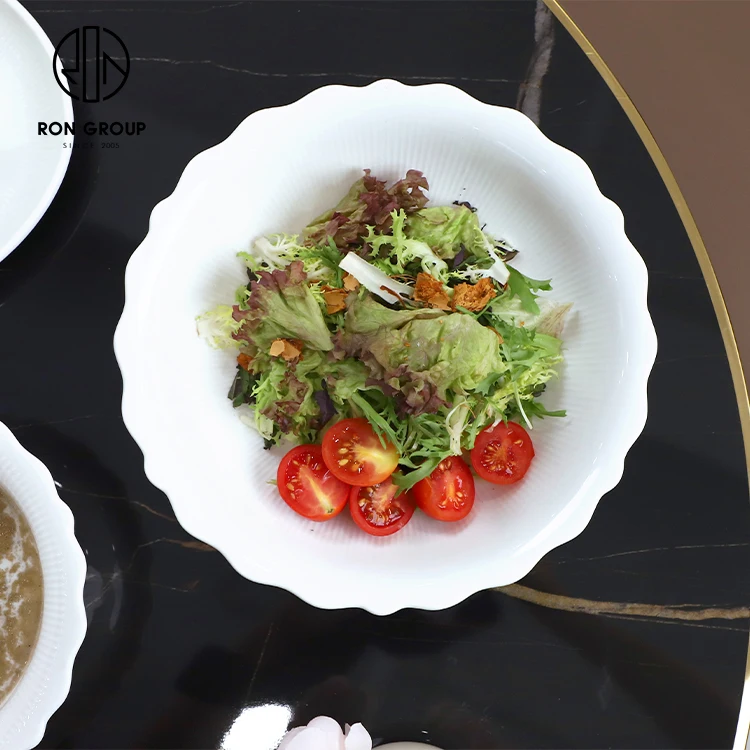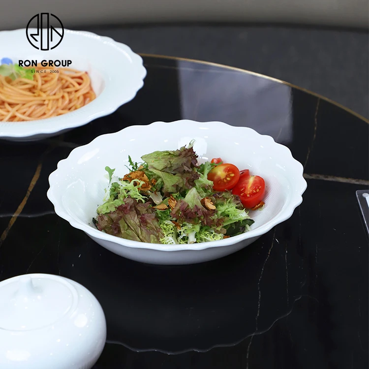 • Custom White Flower Rim Ceramic Soup and Salad Bowl for Restaurant Table Service