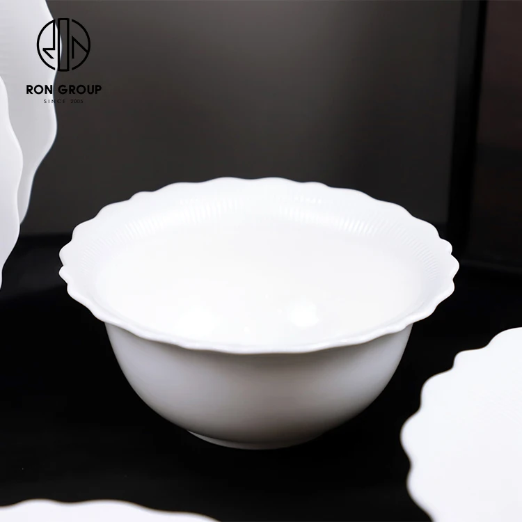 Custom White Flower Rim Ceramic Soup and Salad Bowl for Restaurant Table Service