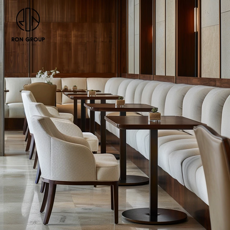 Cream Upholstered Curved Restaurant Booth Seating Set with Walnut Tables and Dining Chairs