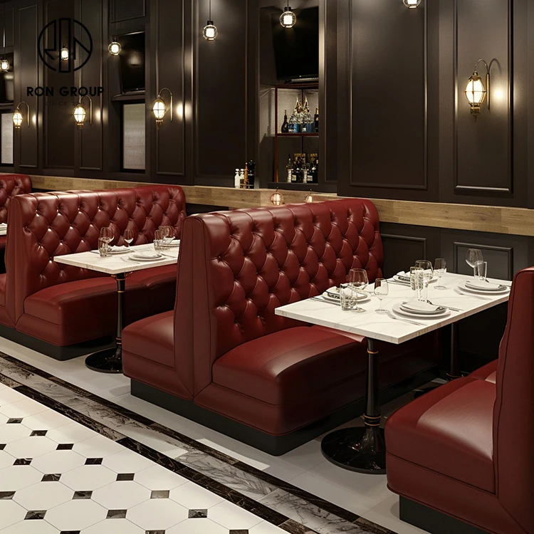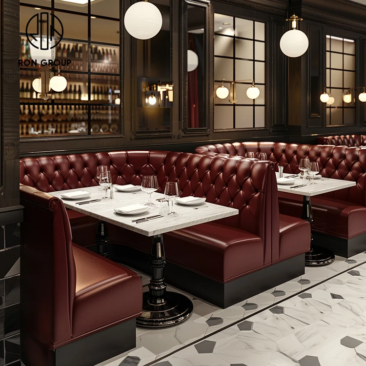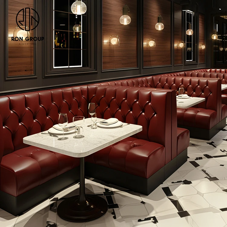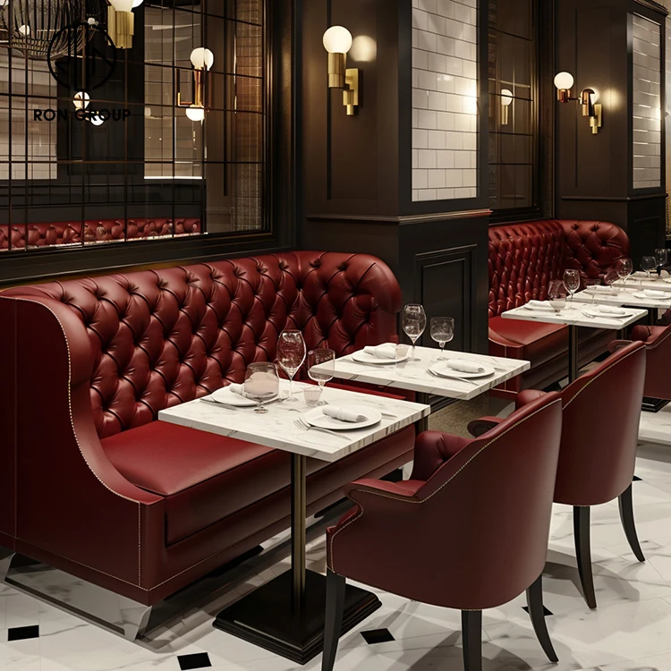 • Luxury Burgundy Tufted Leather Restaurant Booth Seating with Marble Dining Tables