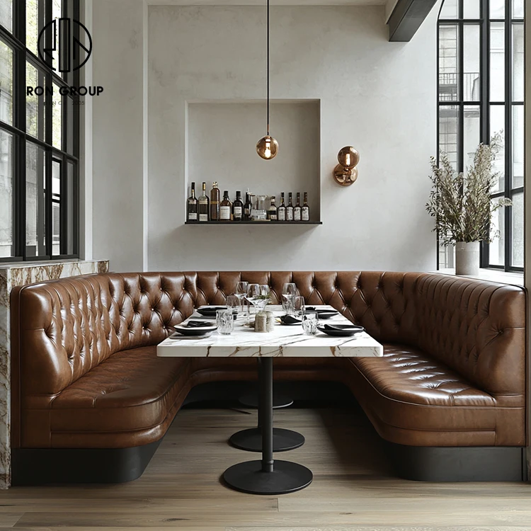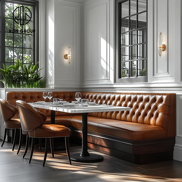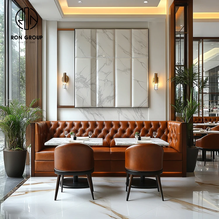 Luxury Brown Tufted Leather Restaurant Booth Seating Set with Marble Dining Tables and Chairs
